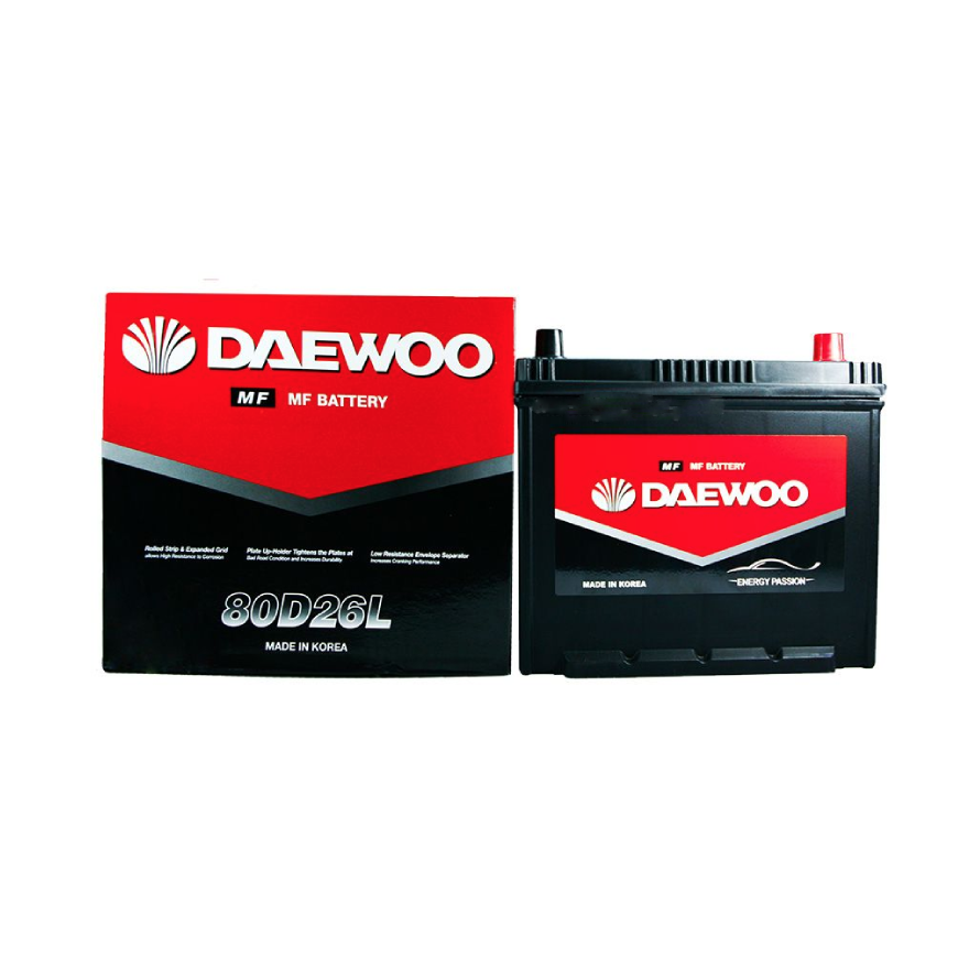 Dòng DEAWOO 80D26L/R nằm trong series DAEWOO MF, ứng dụng công nghệ bản cực Chì – Canxi dập áp lực cao PowerFrame® giúp hạn chế ăn mòn, giảm thất thoát nước điện phân và kéo dài tuổi thọ sử dụng. Kết hợp cùng tấm ngăn dạng bao thư có điện trở thấp, bình cho hiệu suất khởi động mạnh mẽ — dòng đề tăng đến khoảng 70%.