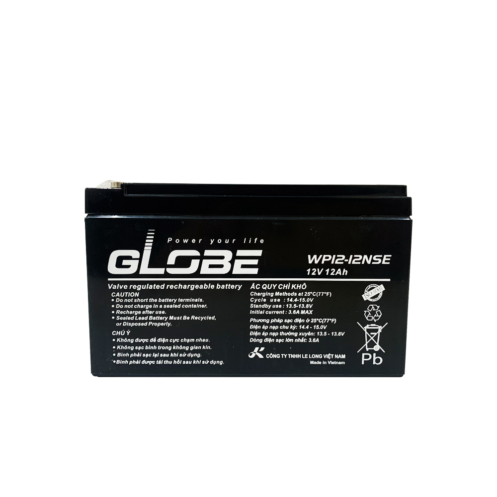 - Ắc Quy GLOBE WP12-12 (12V-12AH) được thiết kế dành cho ứng dụng nguồn điện dự phòng cho an ninh hay hệ thống cảnh báo chữa cháy, ắc quy được sử dụng cho đèn thoát hiểm, tín hiệu cảnh báo, chiếu sáng, hay hệ thống bảo mật, nó vẫn có thể cho phép các hoạt động diễn ra liên tục trong một khoảng thời gian nhất định nếu thành phố bị mất điện lưới do hoả hoạn, động đất, nhằm đảm bảo an toàn cho tính mạng và tài sản của con người.